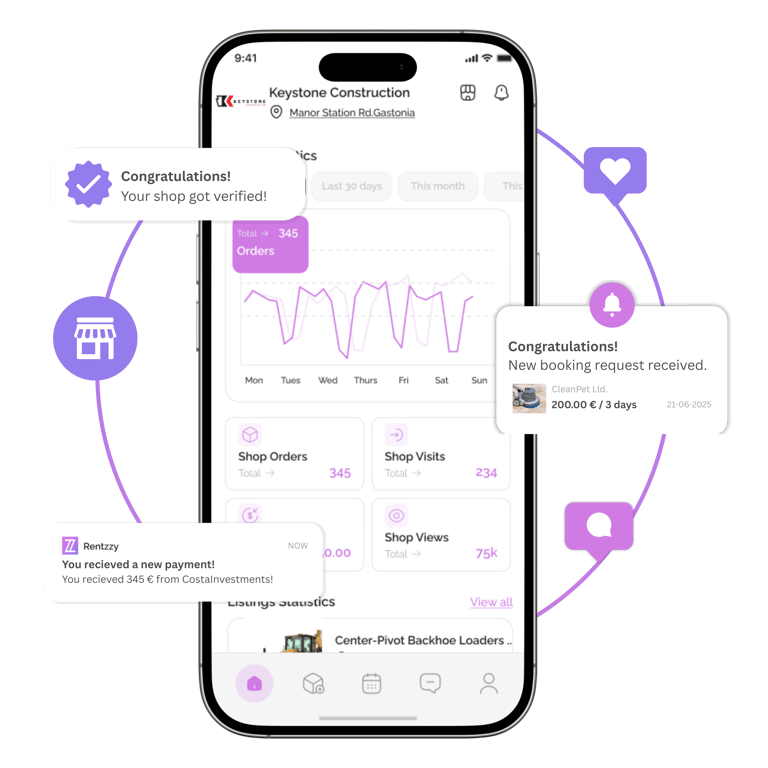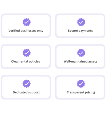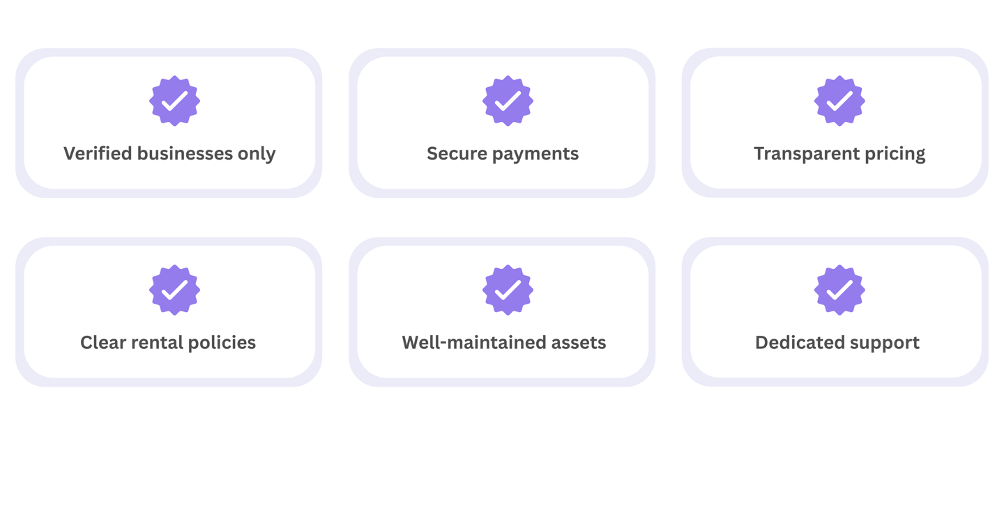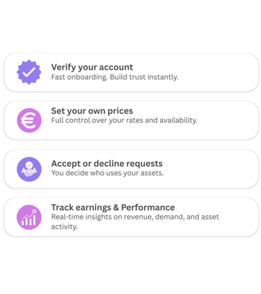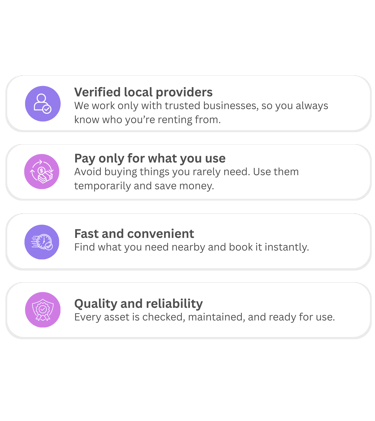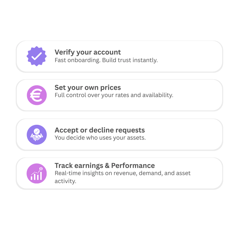 Businesses sit on valuable assets that earn nothing for most of the year. We help you turn that idle value into secure, verified income. Set your rules, choose who rents from you, and get paid when your assets work instead of sitting idle.