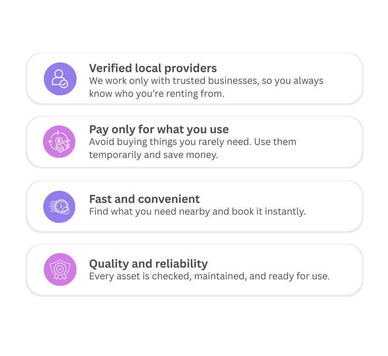 We give you fast, reliable access to the things you need from verified local providers. No ownership. No maintenance.No long-term commitments. Just simple, secure access whenever you need it.